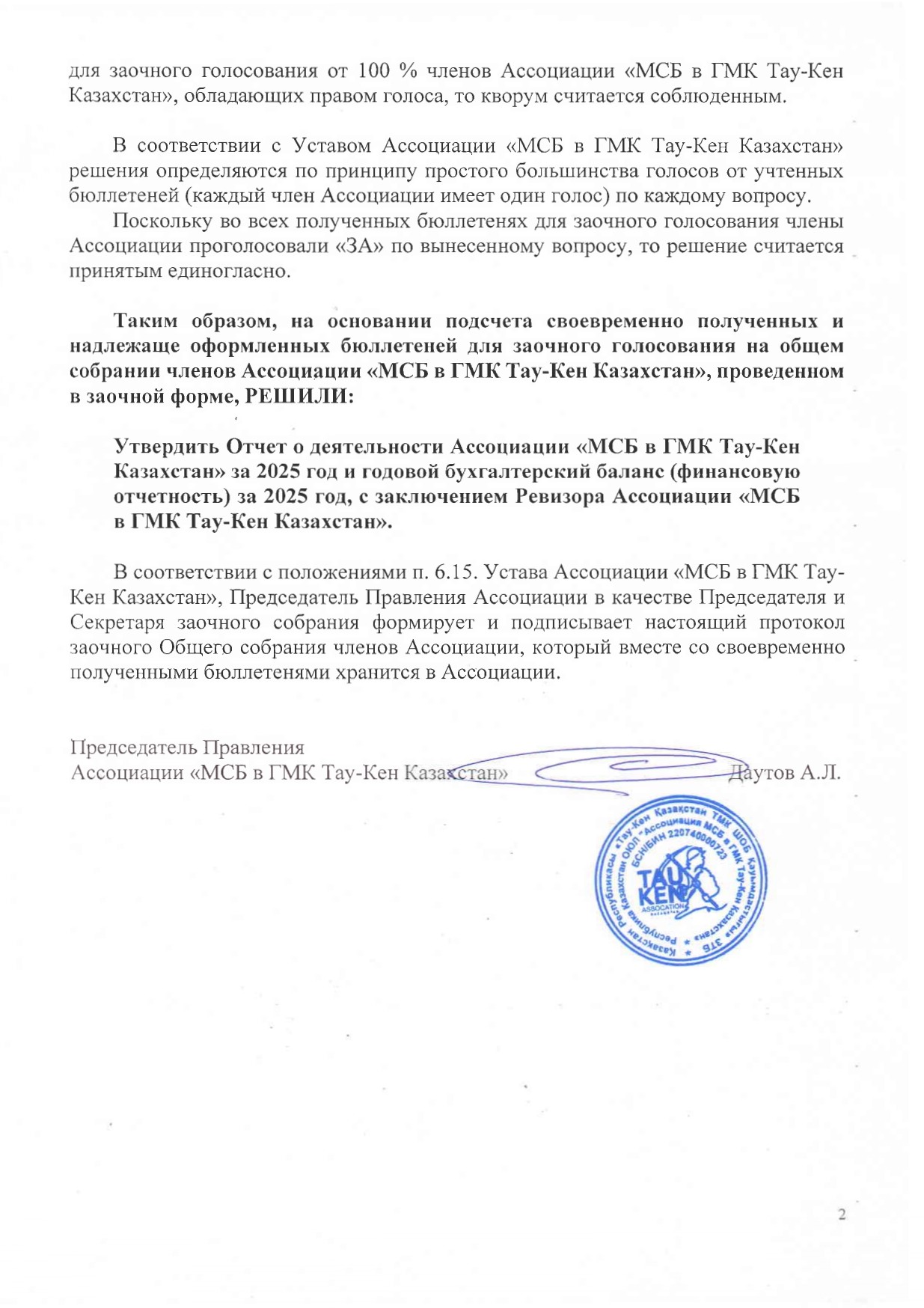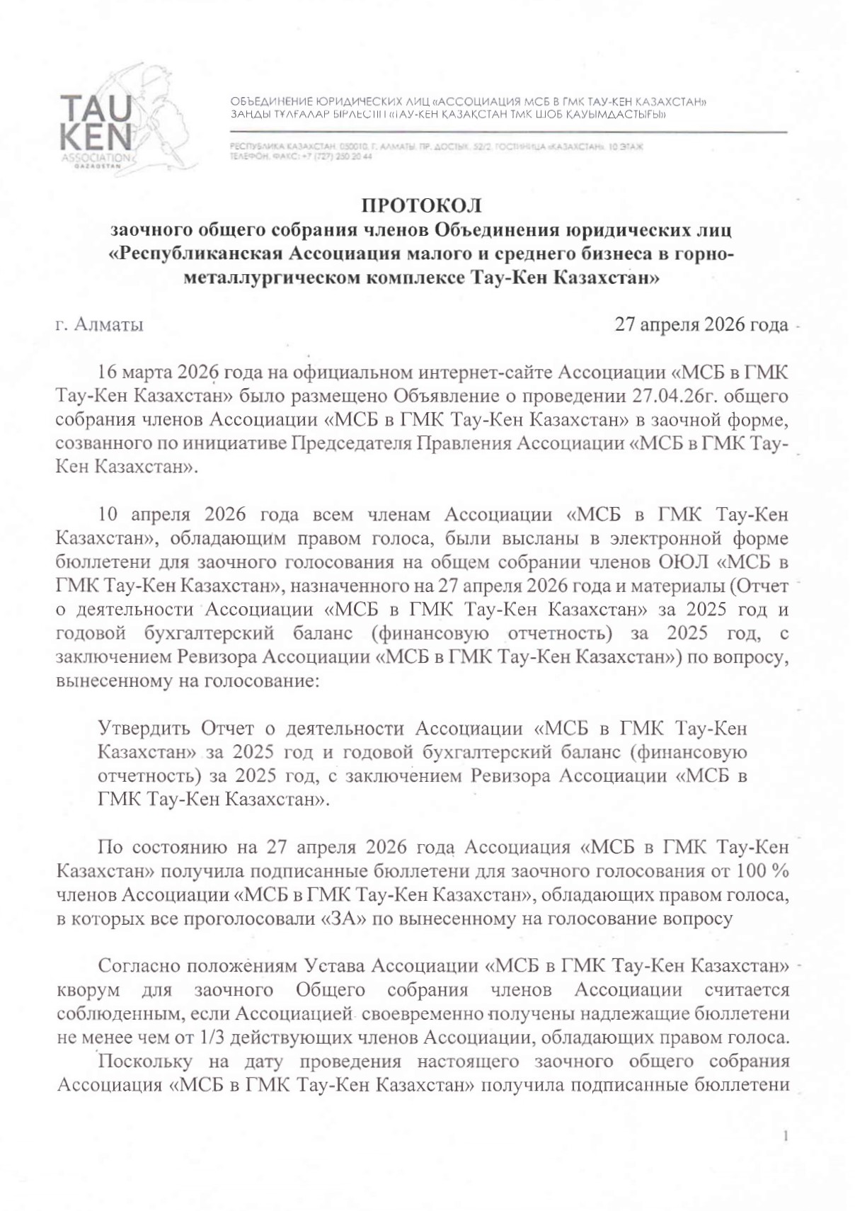 По состоянию на 27 апреля 2026 года Ассоциация «МСБ в ГМК Тау-Кен Казахстан» получила подписанные бюллетени для заочного голосования от 100 % членов Ассоциации «МСБ в ГМК Тау-Кен Казахстан», обладающих правом голоса, в которых все проголосовали «ЗА» по вынесенному на голосование вопросу