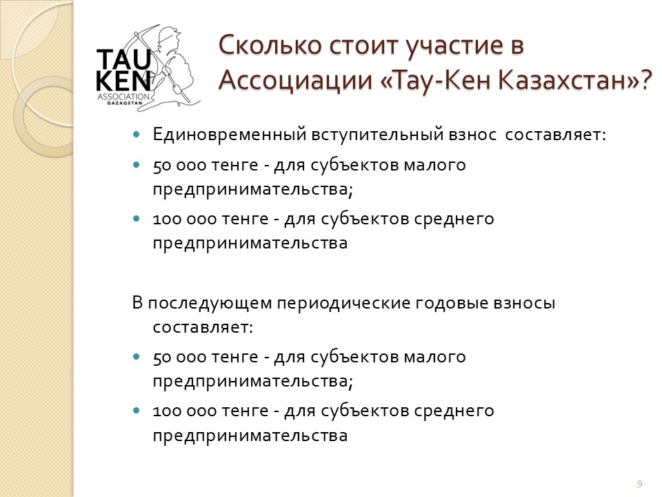 Вступающие в ОЮЛ «Ассоциация МСБ в ГМК Тау-Кен Казахстан» члены вносят вступительный взнос в размере и в сроки, определенные Положением о взносах ОЮЛ «Ассоциация МСБ в ГМК Тау-Кен Казахстан».